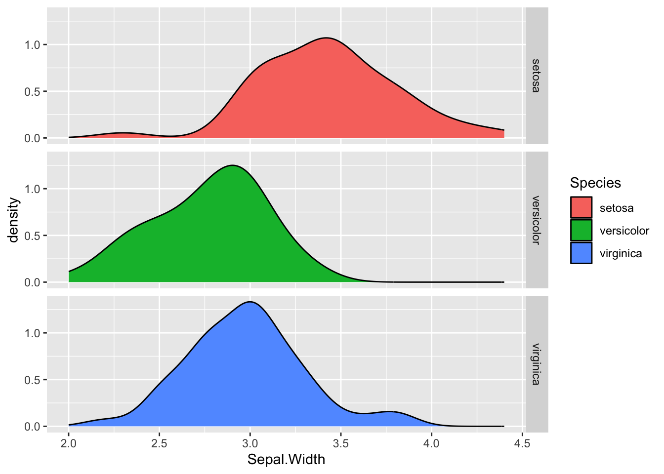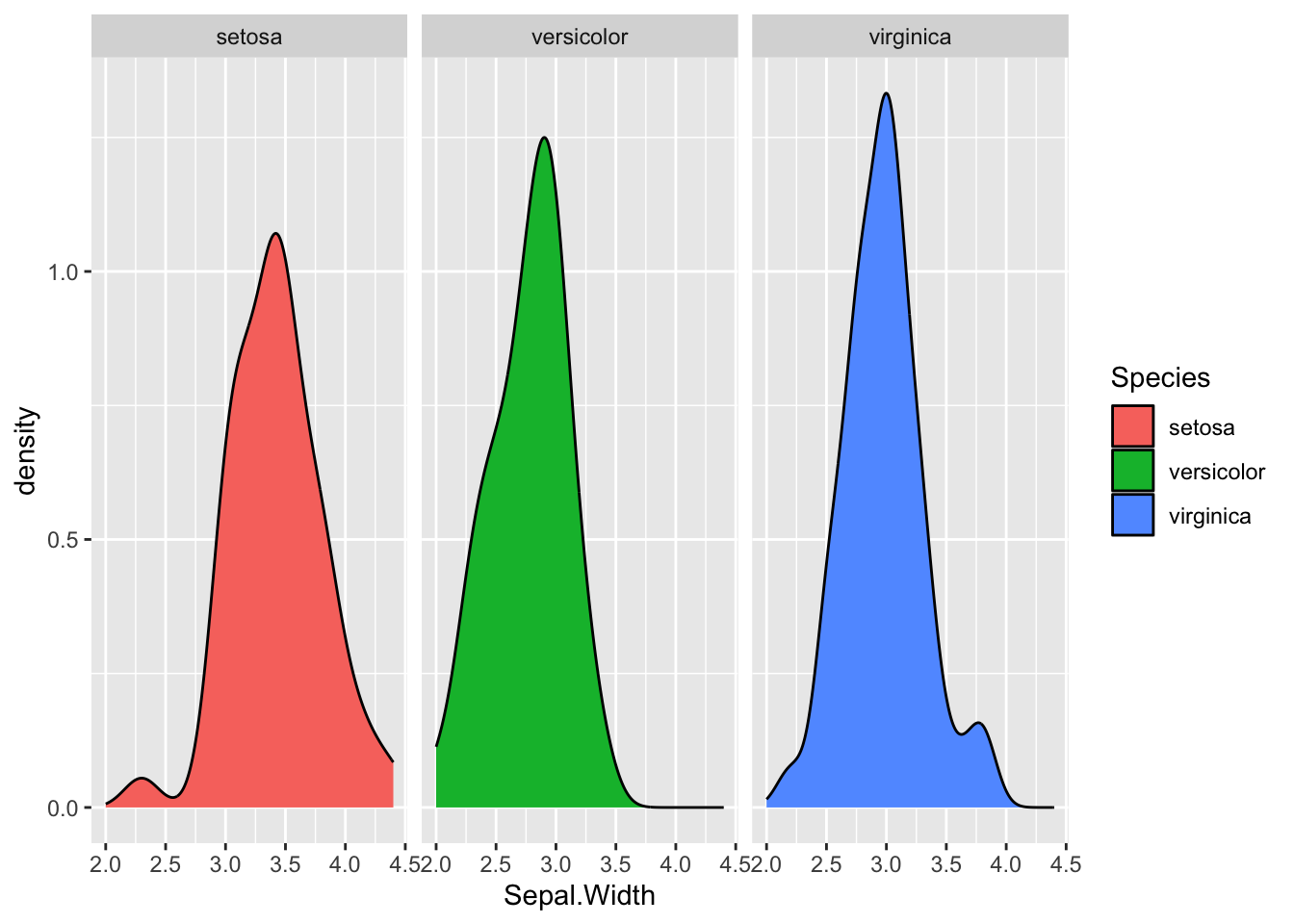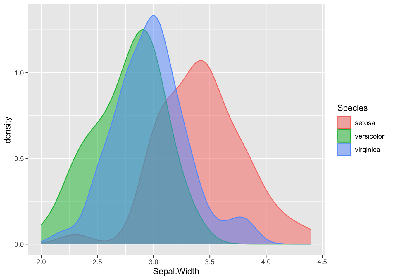 ggplot(iris, aes(x = Sepal.Width, fill = Species, color = Species)) +geom_density(alpha =0.5)