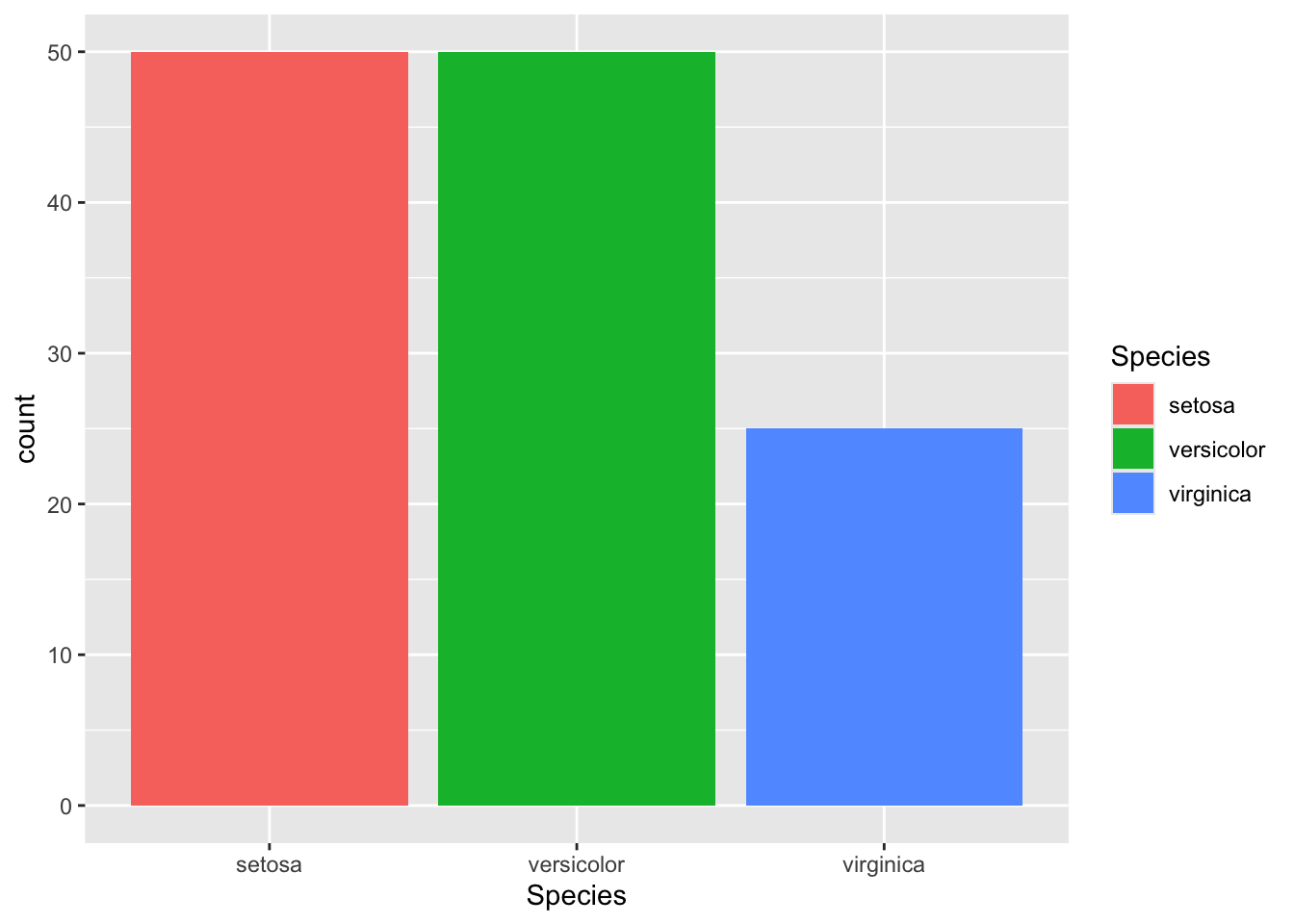 ggplot(iris[1:125,], aes(x = Species, fill = Species)) +geom_bar()