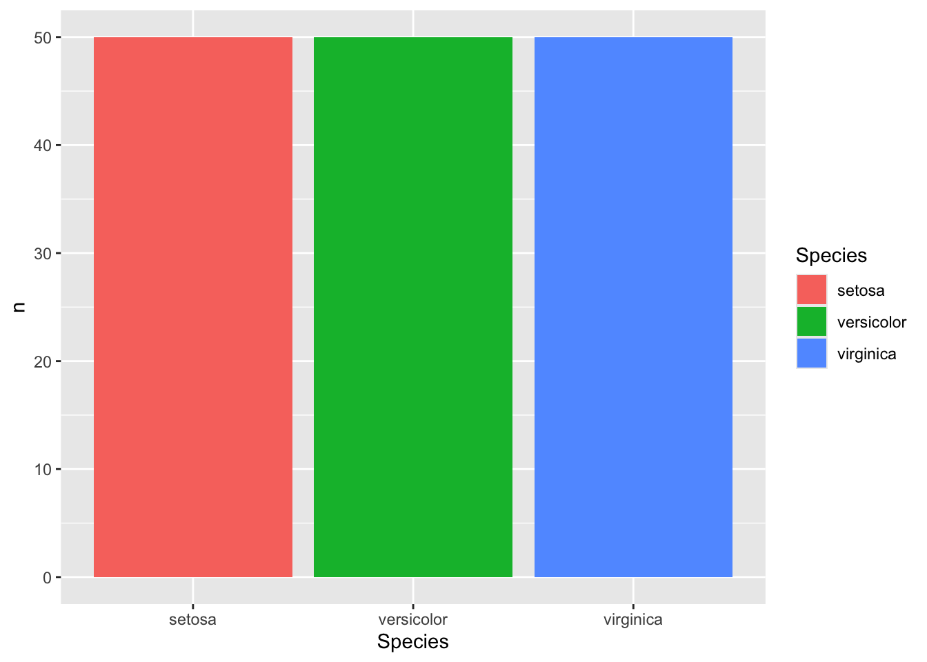 ### geom_bar()iris %>%count(Species) %>%# have to give the count as the argument for y nowggplot(aes(x = Species, y = n, fill = Species)) +geom_bar(stat ='identity')
