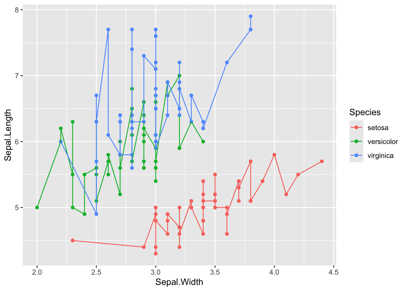ggplot(iris, aes(x = Sepal.Width, y = Sepal.Length, color = Species)) +geom_point() +geom_line()