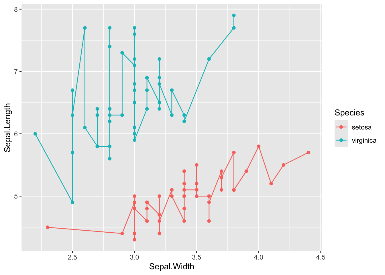 iris %>%filter(Species !="versicolor") %>%ggplot(aes(x = Sepal.Width, y = Sepal.Length, color = Species)) +geom_point() +geom_line()