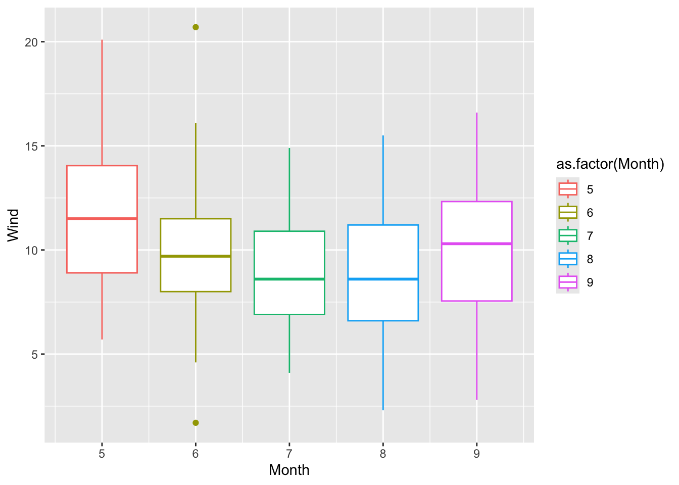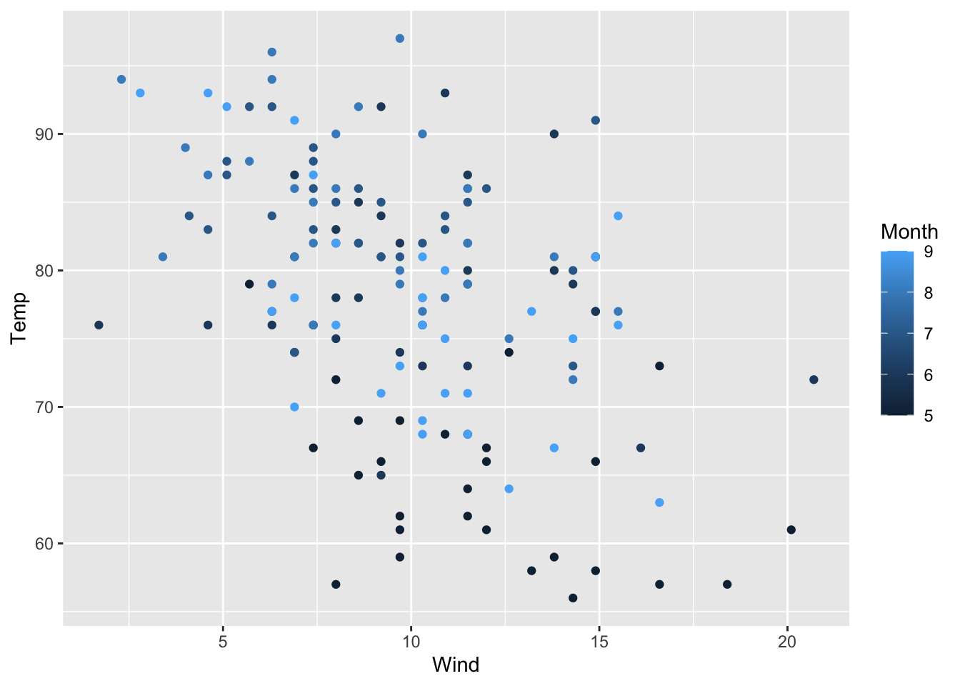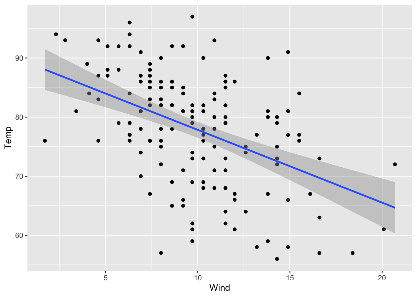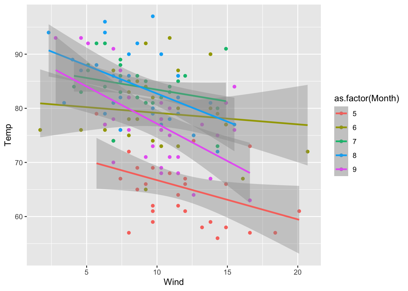 airquality %>%ggplot(aes(x = Wind, y = Temp, color =as.factor(Month))) +geom_point() +geom_smooth(method = lm)
