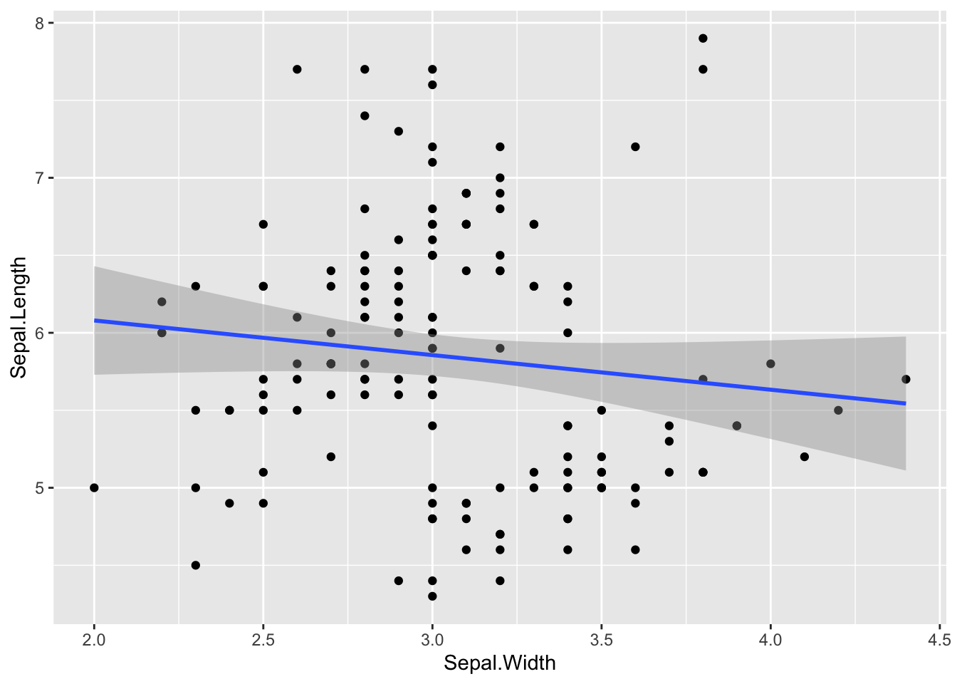 # with line of best fitggplot(iris, aes(x = Sepal.Width, y = Sepal.Length)) +geom_point() +geom_smooth(method = lm)