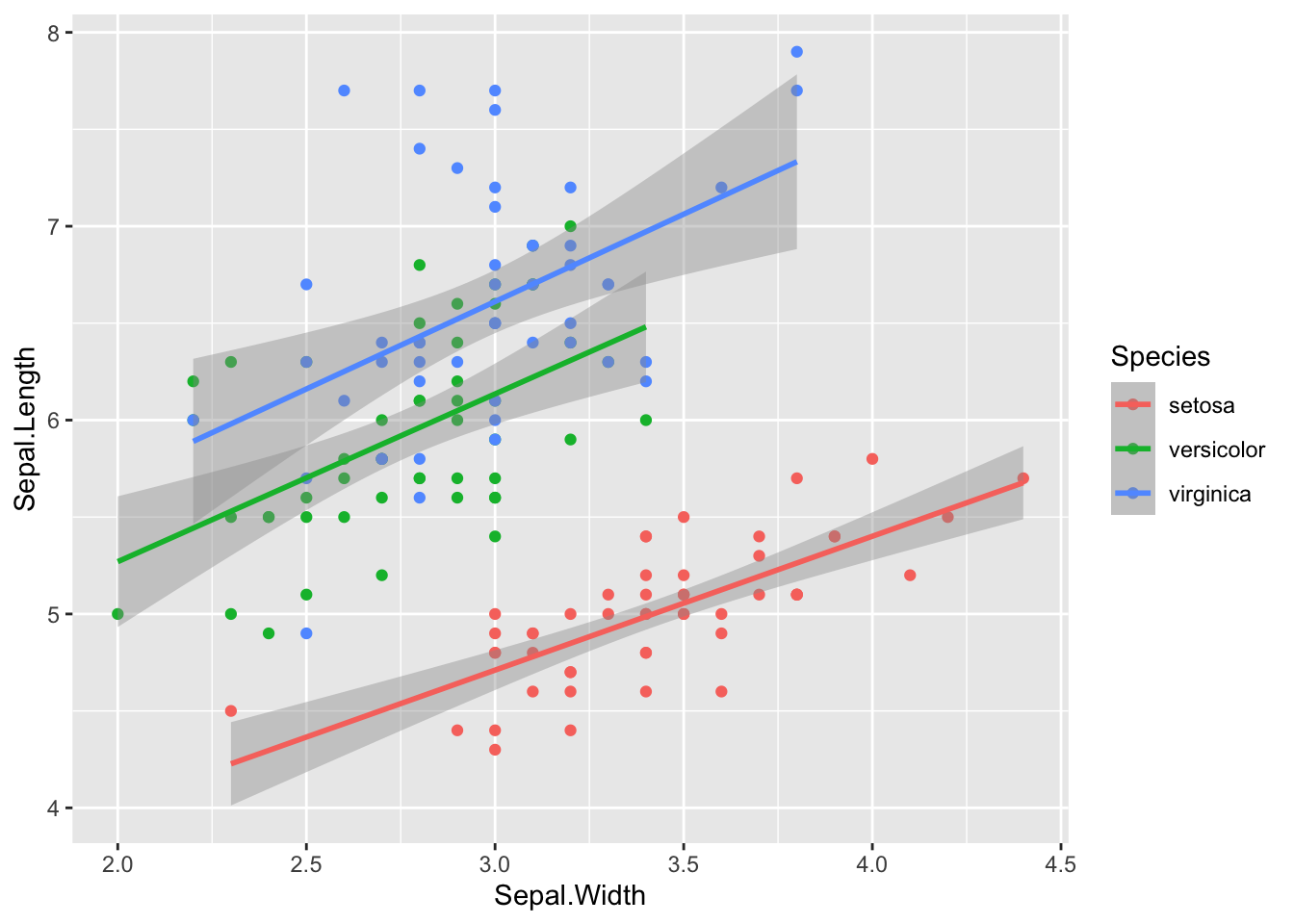 # if you color by something, each subgroup will automatically get it's own lineggplot(iris, aes(x = Sepal.Width, y = Sepal.Length, color = Species)) +geom_point() +geom_smooth(method = lm)