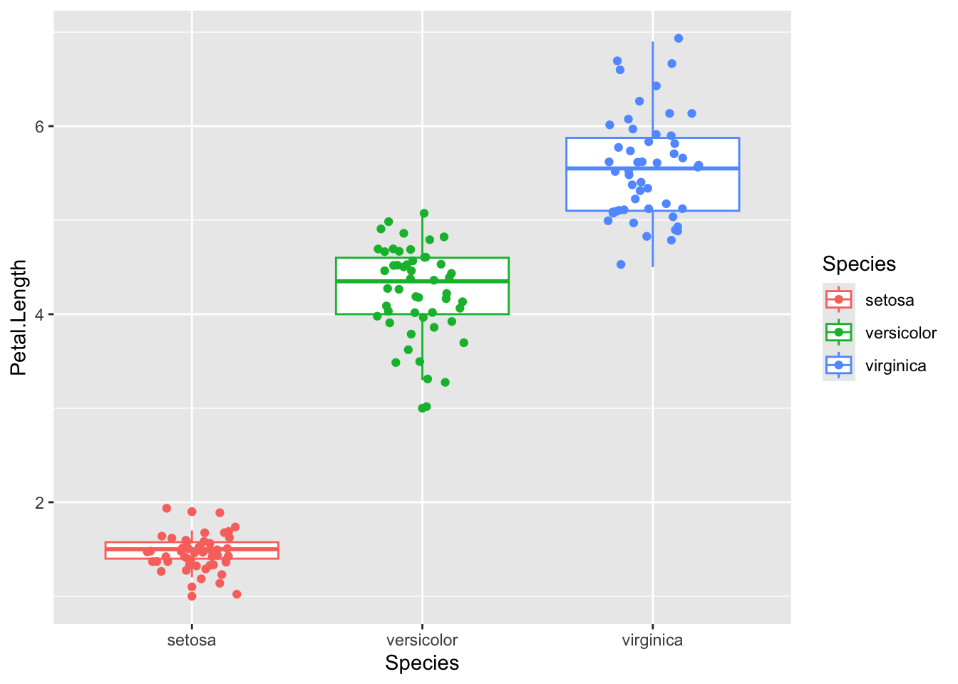 ggplot(iris, aes(x = Species, y = Petal.Length, color = Species)) +geom_boxplot() +geom_jitter(width =0.2)