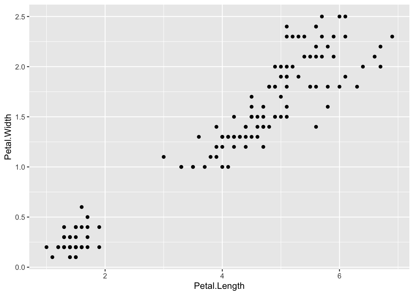 # plot(iris$Petal.Length, iris$Petal.Width)ggplot(iris, aes(x = Petal.Length, y = Petal.Width)) +geom_point()