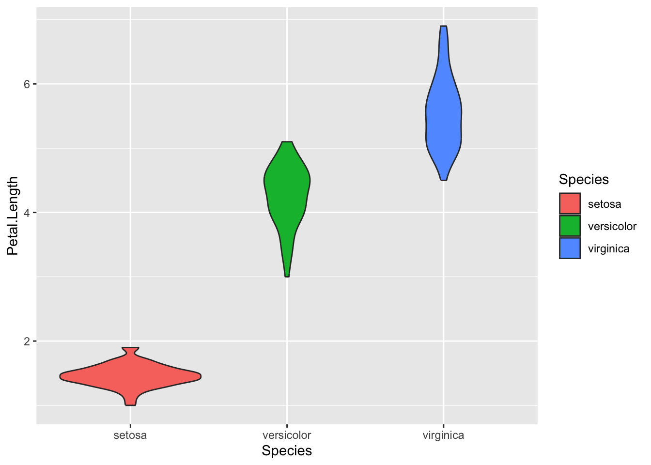 ggplot(iris, aes(x = Species, y = Petal.Length, fill = Species)) +geom_violin()