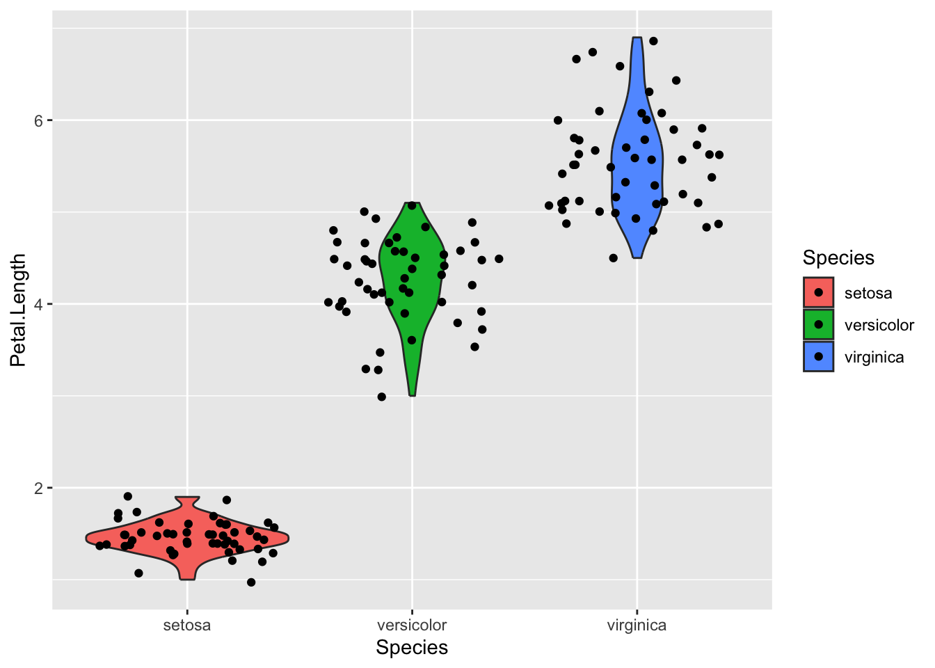 ggplot(iris, aes(x = Species, y = Petal.Length, fill = Species)) +geom_violin() +geom_jitter()