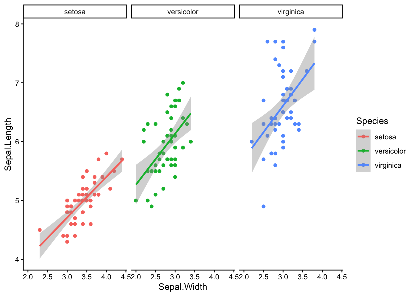 ggplot(iris, aes(x = Sepal.Width, y = Sepal.Length, color = Species)) +geom_point() +facet_wrap( ~ Species) +geom_smooth(method = lm) +theme_classic()