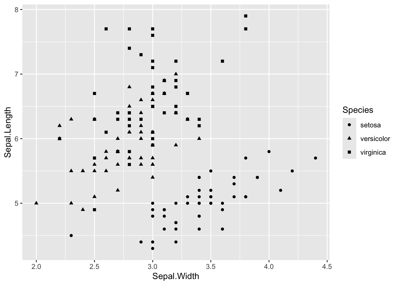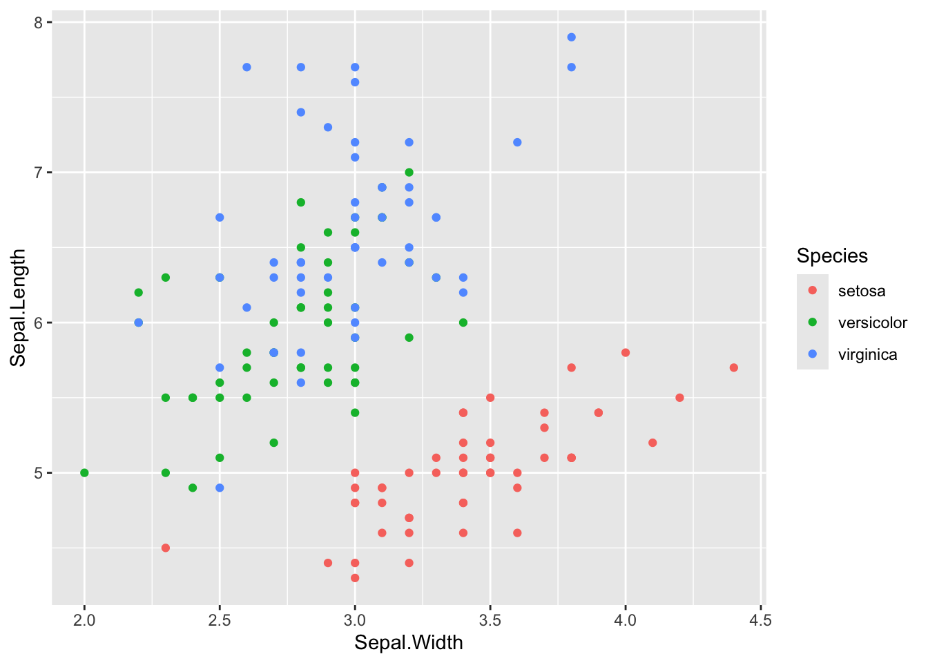 ggplot(iris, aes(x = Sepal.Width, y = Sepal.Length, color = Species)) +geom_point()