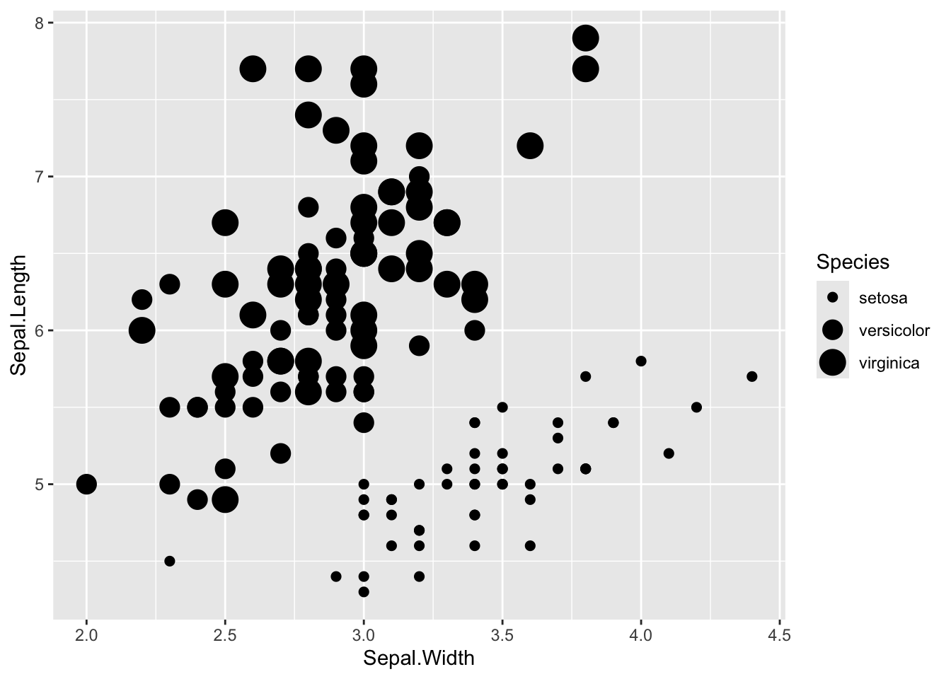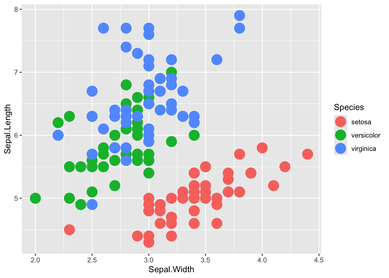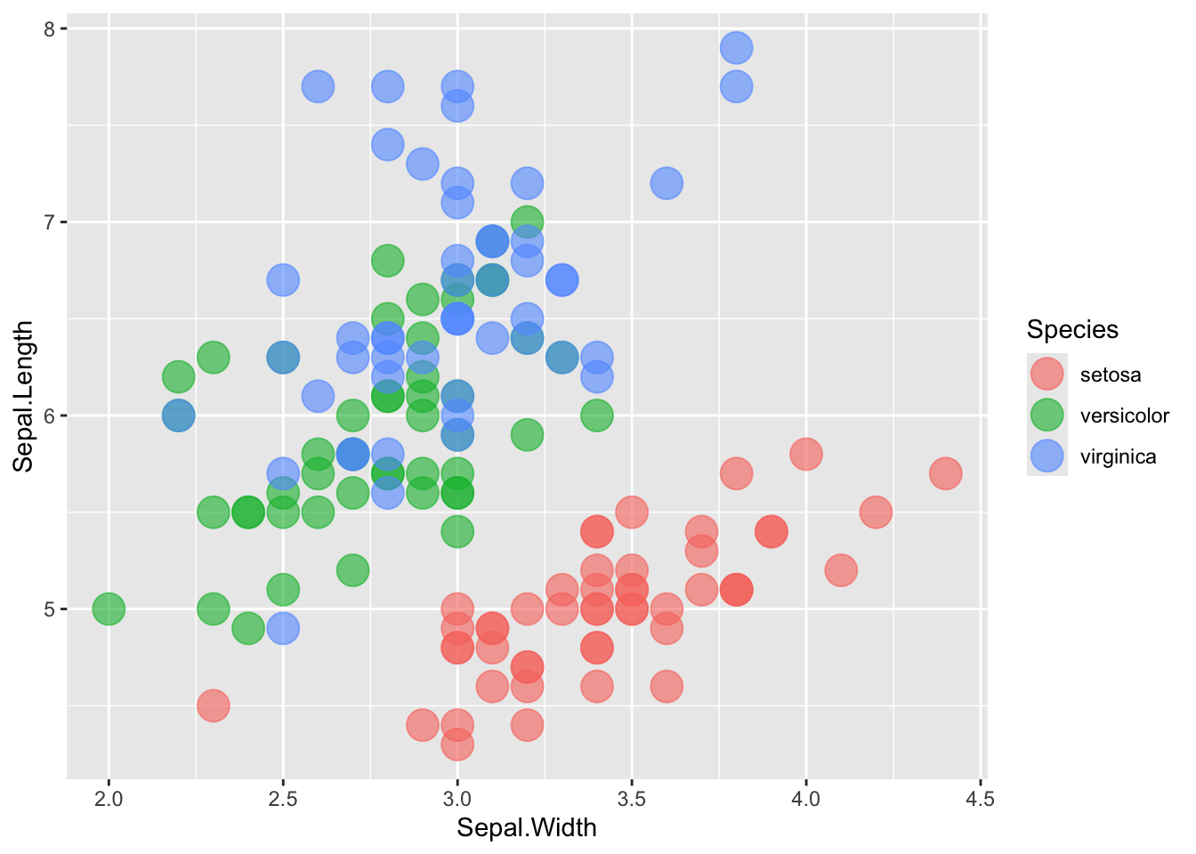 # without transparencyggplot(iris, aes(x = Sepal.Width, y = Sepal.Length, color = Species)) +geom_point(size =6)