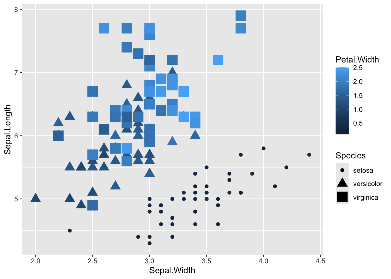 ggplot(iris, aes(x = Sepal.Width, y = Sepal.Length, color = Petal.Width, shape = Species, size = Species)) +geom_point()