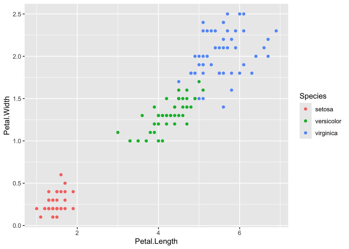 ggplot(iris, aes(x = Petal.Length, y = Petal.Width, color = Species)) +geom_point()
