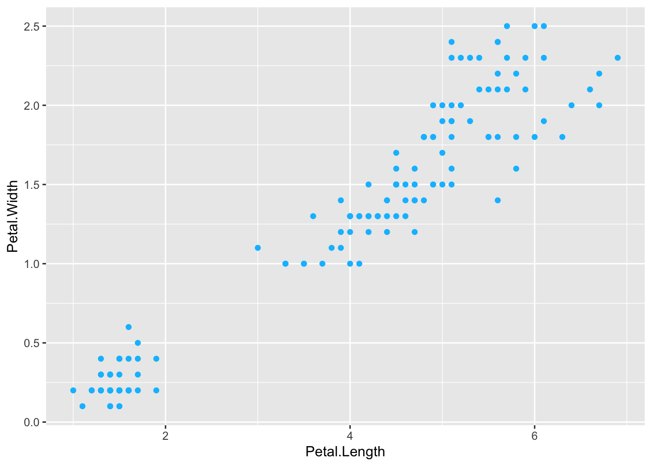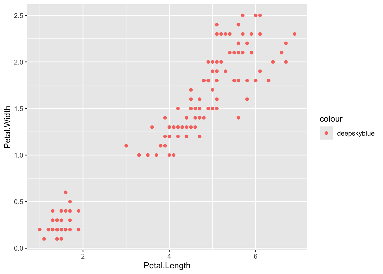 # BUT if I put color = 'deepskyblue' instead an aes() it won't work; ggplot thinks it's a data featureggplot(iris, aes(x = Petal.Length, y = Petal.Width, color ='deepskyblue')) +geom_point()