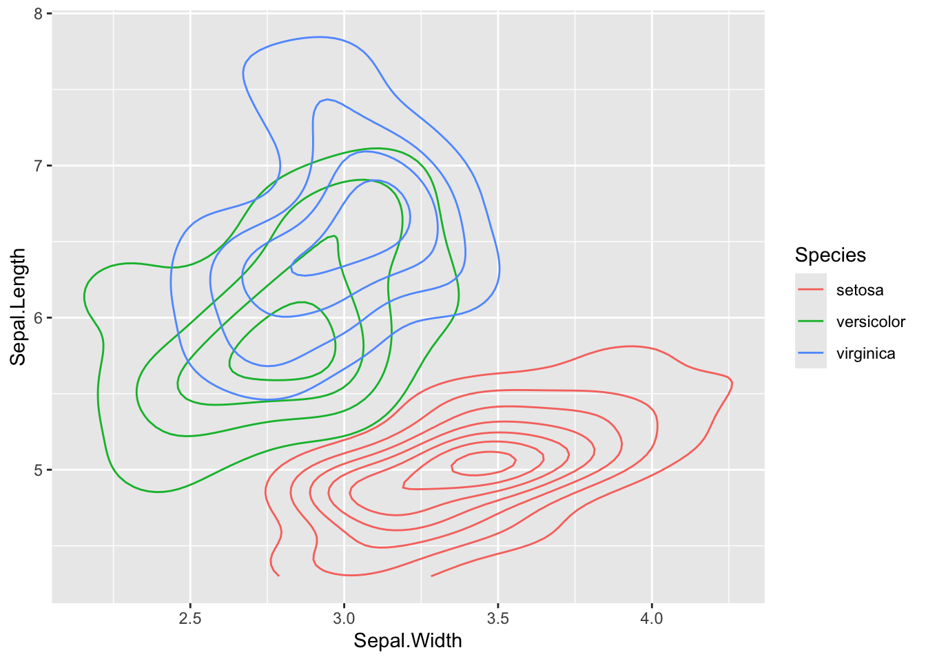 # plot before labellingggplot(iris, aes(x = Sepal.Width, y = Sepal.Length, color = Species)) +geom_density_2d()