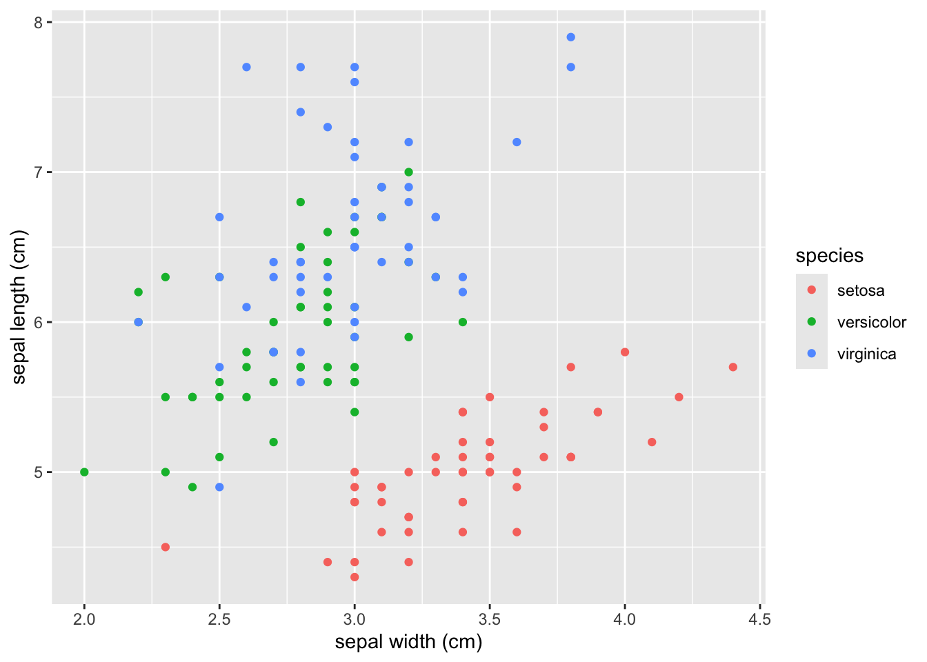 ggplot(iris, aes(x = Sepal.Width, y = Sepal.Length, color = Species)) +geom_point() +scale_x_continuous(name ='sepal width (cm)') +scale_y_continuous('sepal length (cm)') +scale_color_discrete('species')