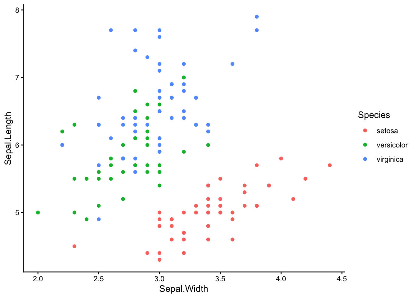 ggplot(iris, aes(x = Sepal.Width, y = Sepal.Length, color = Species)) +geom_point() +theme_classic()