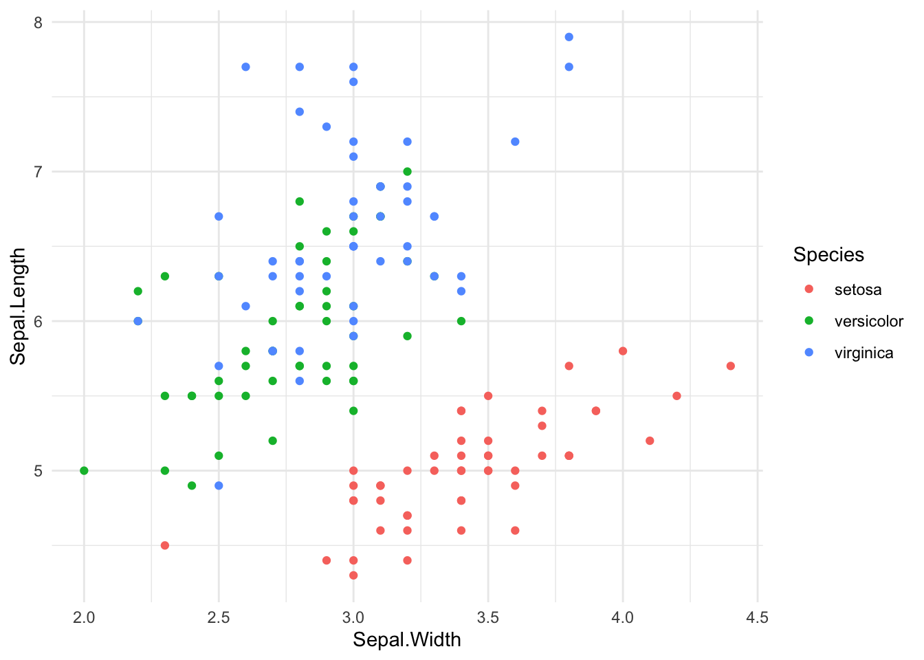ggplot(iris, aes(x = Sepal.Width, y = Sepal.Length, color = Species)) +geom_point() +theme_minimal()
