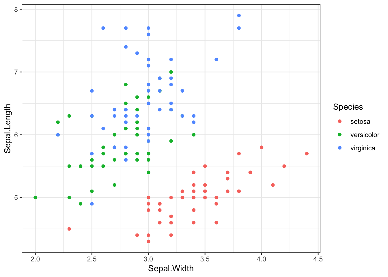ggplot(iris, aes(x = Sepal.Width, y = Sepal.Length, color = Species)) +geom_point() +theme_bw()
