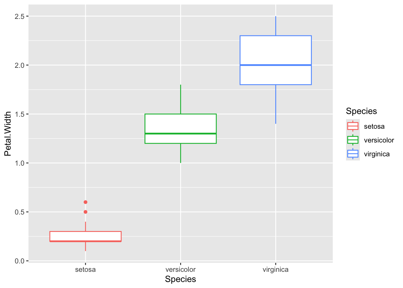 iris %>%ggplot(aes(x = Species, y = Petal.Width, color = Species)) +geom_boxplot()