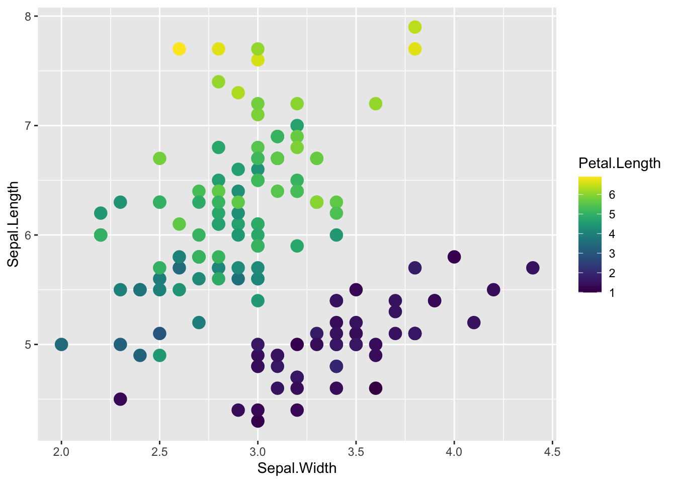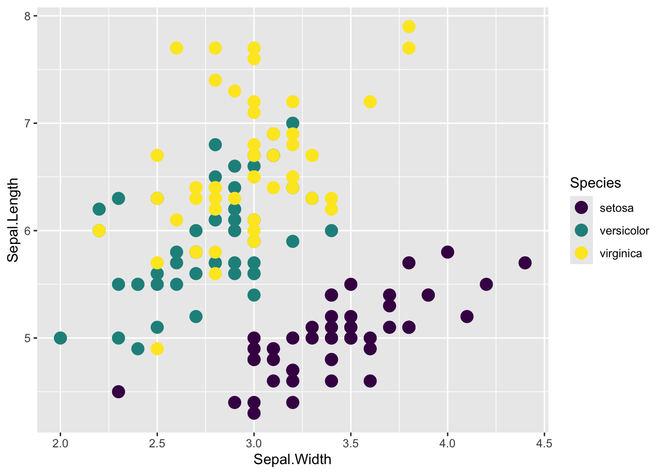 ### ORggplot(iris, aes(x = Sepal.Width, y = Sepal.Length, color = Species)) +geom_point(size =4) +scale_color_viridis_d()