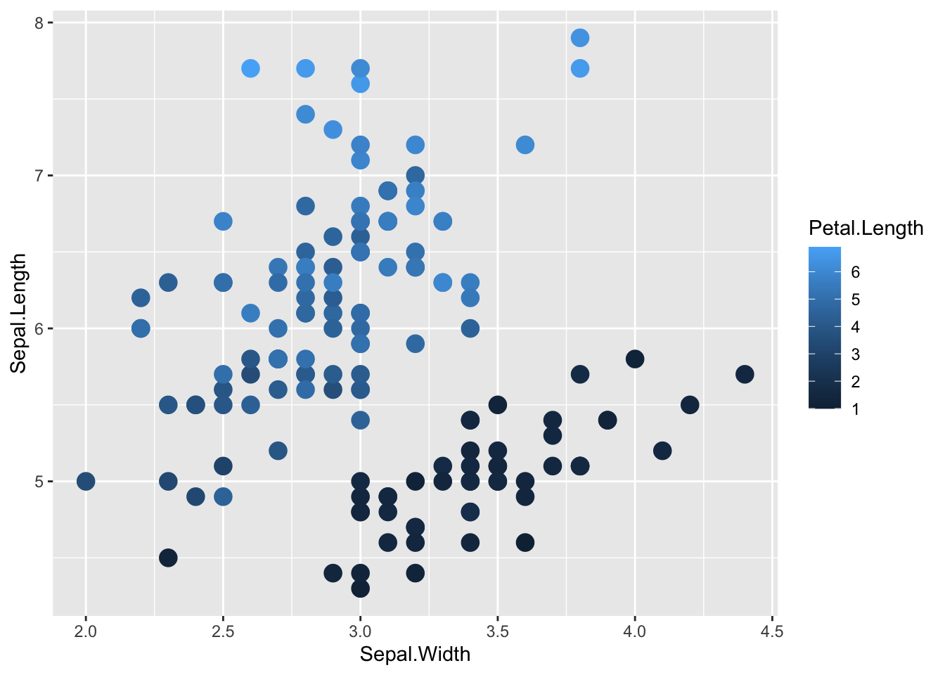 # default ggplot() continuous color scaleggplot(iris, aes(x = Sepal.Width, y = Sepal.Length, color = Petal.Length)) +geom_point(size =4)