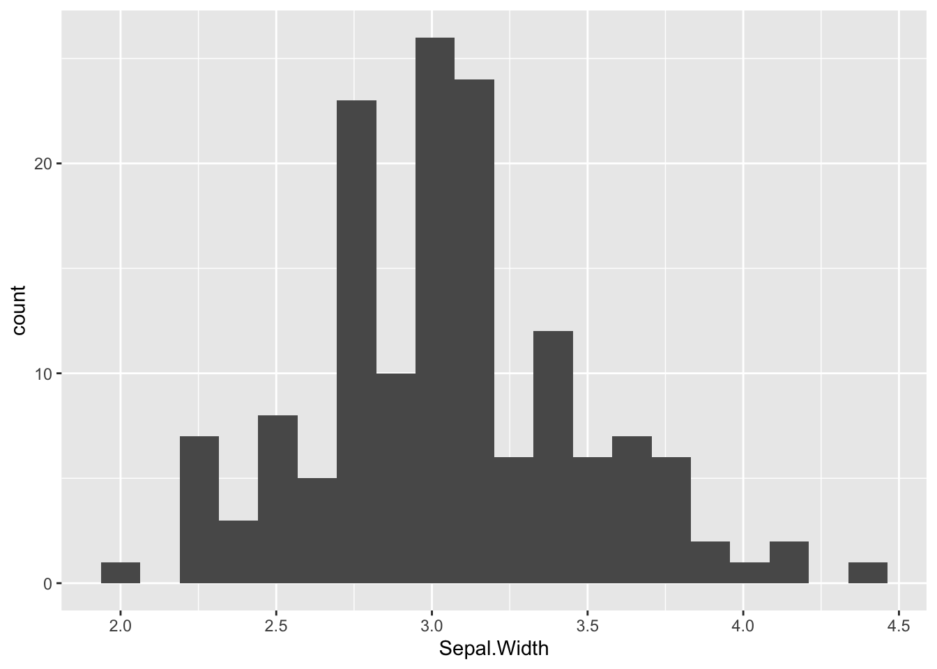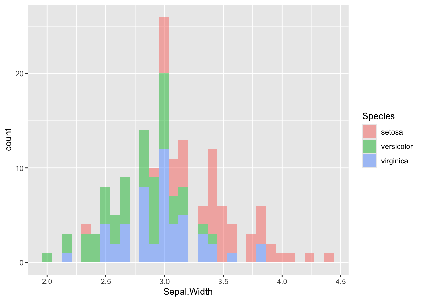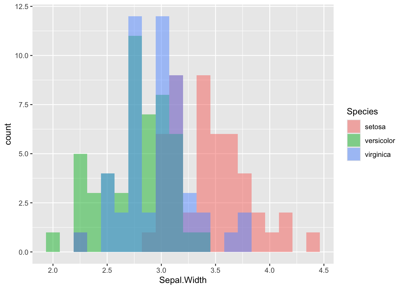 # use position = 'identity' for overlapping histogramsggplot(iris, aes(x = Sepal.Width, fill = Species)) +geom_histogram(position ='identity', alpha =0.5, bins =20)